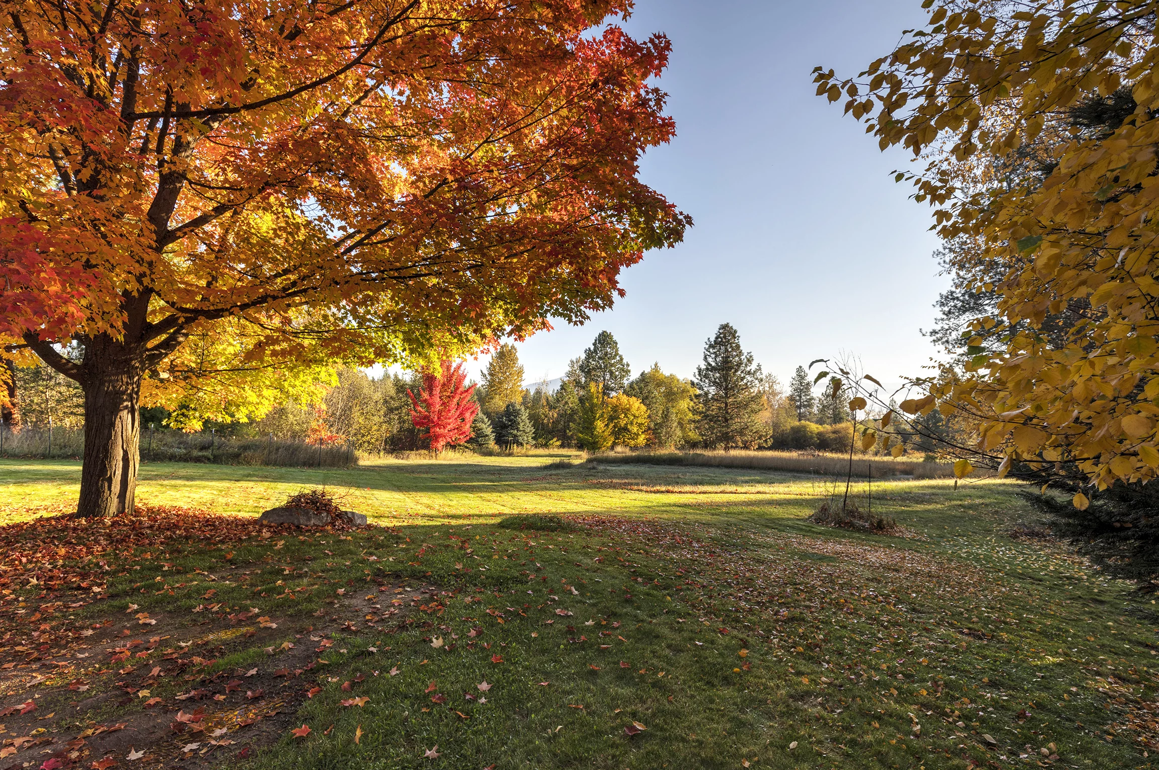 One Horse Creek runs for nearly half a mile across the property, which also features two spring-fed ponds, two irrigation ditches, grassy pastures for horses or cattle, and a diverse mix of pine and deciduous trees, including Maples and Oaks that offer brilliant fall color. One Horse Creek flows right near the home, enhancing the natural setting. The landscape blends mature timber and open meadows, creating both seclusion and expansive Bitterroot Mountain views. Large-acre neighboring parcels add to the peaceful rural setting.