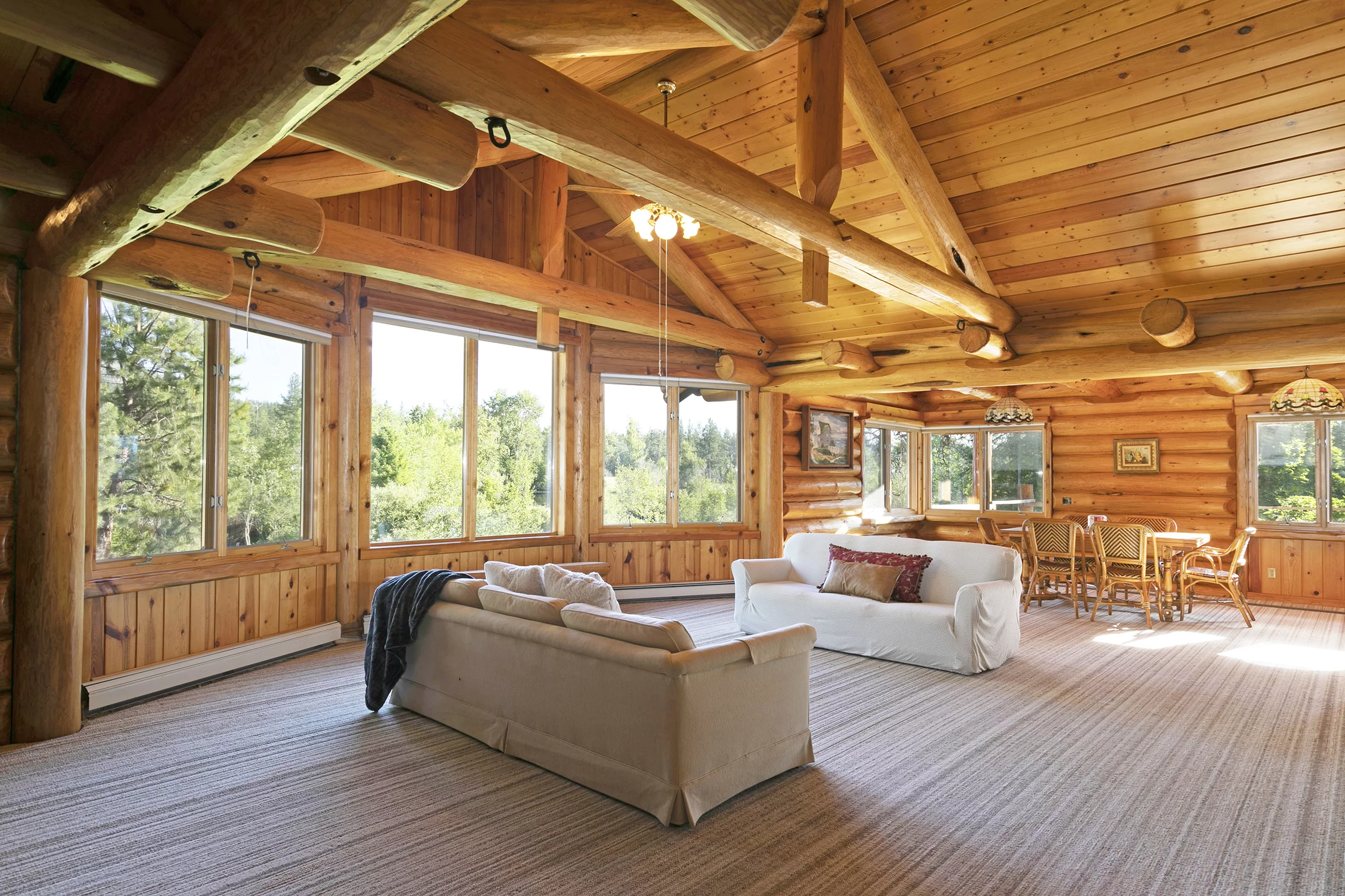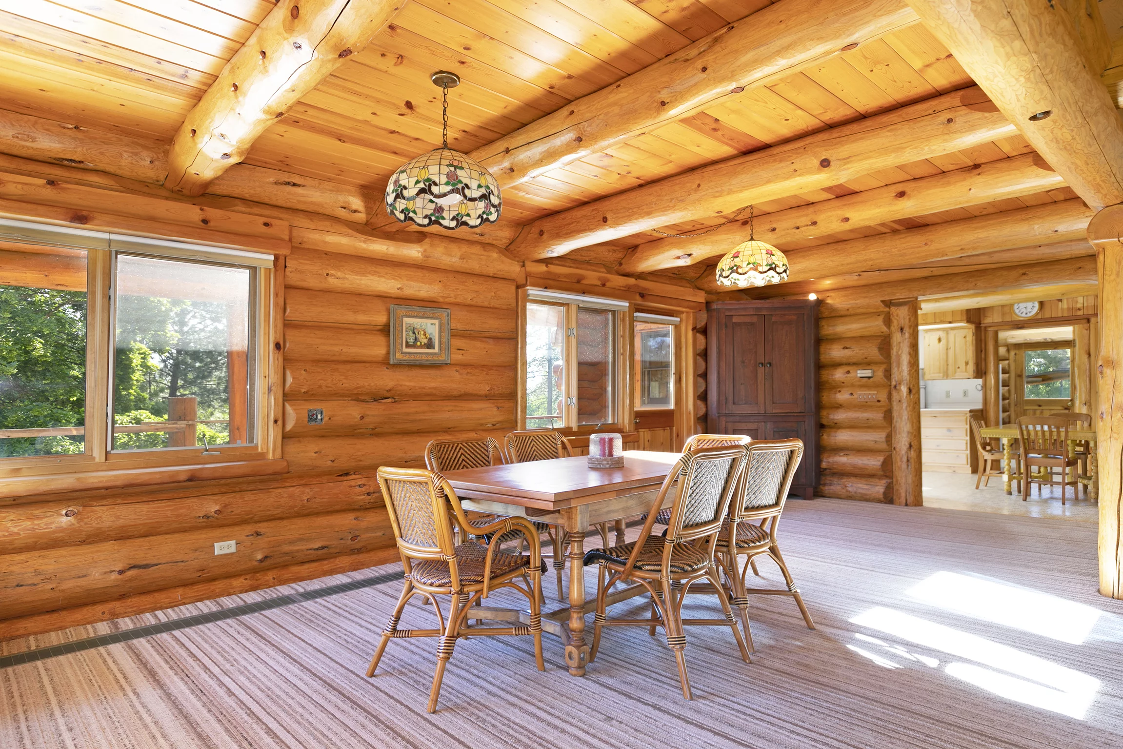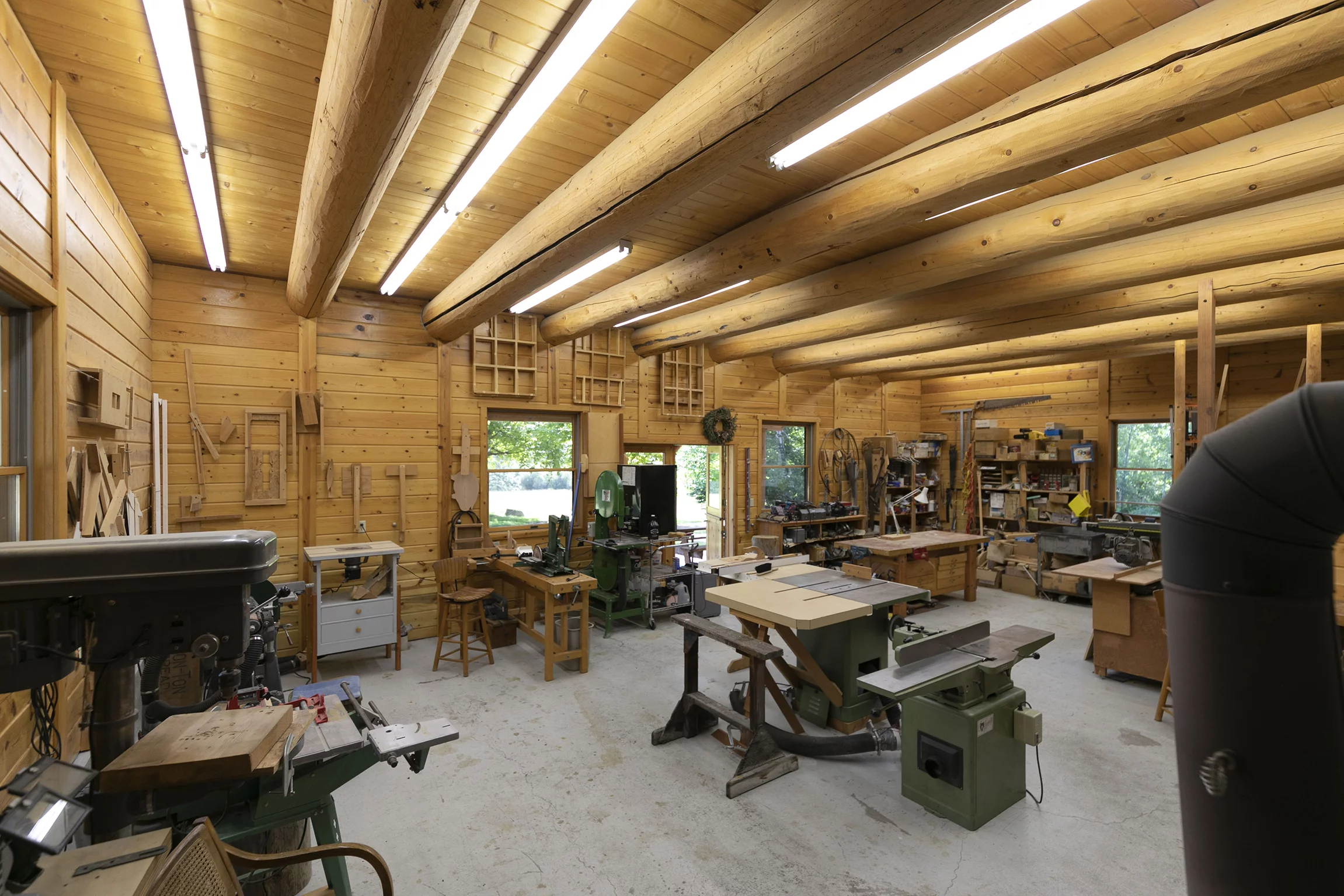 A three-car detached garage sits adjacent to the main home. It features the same log construction as the home and an incredible woodworking shop that could be reimagined as an event space or art studio, thanks to its large picture windows and abundant natural light throughout.