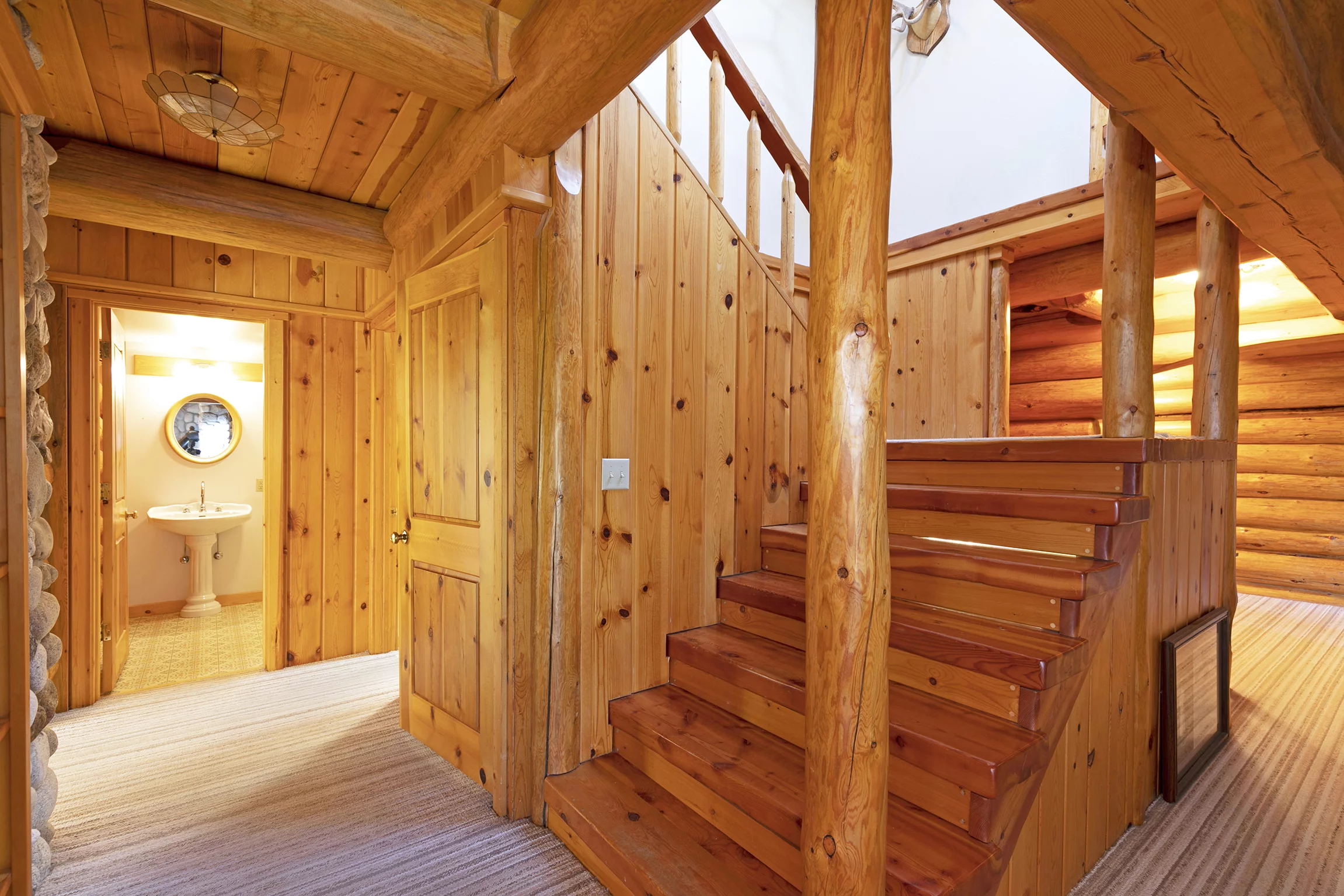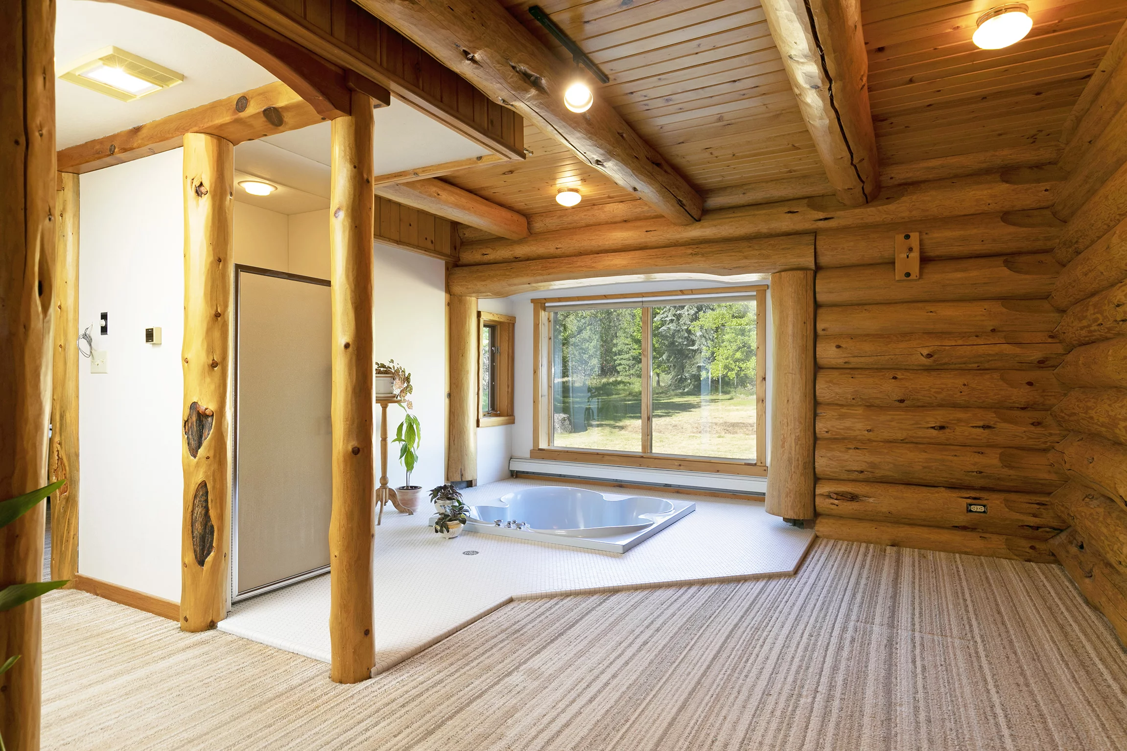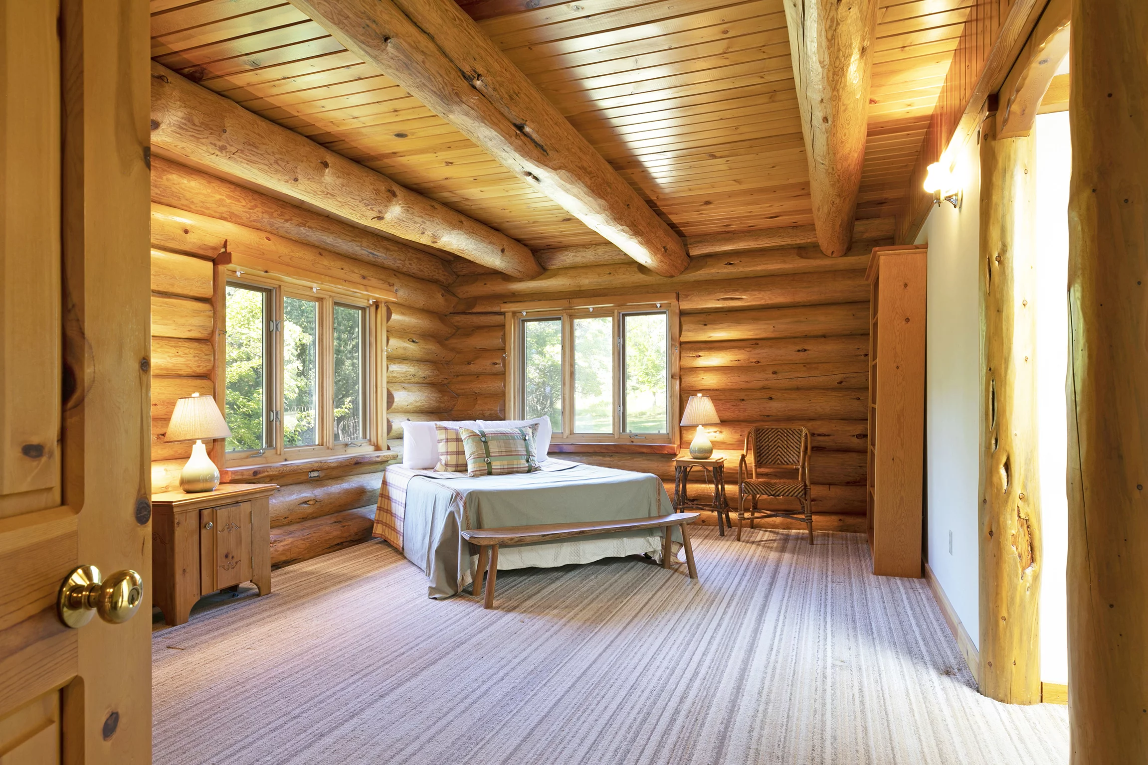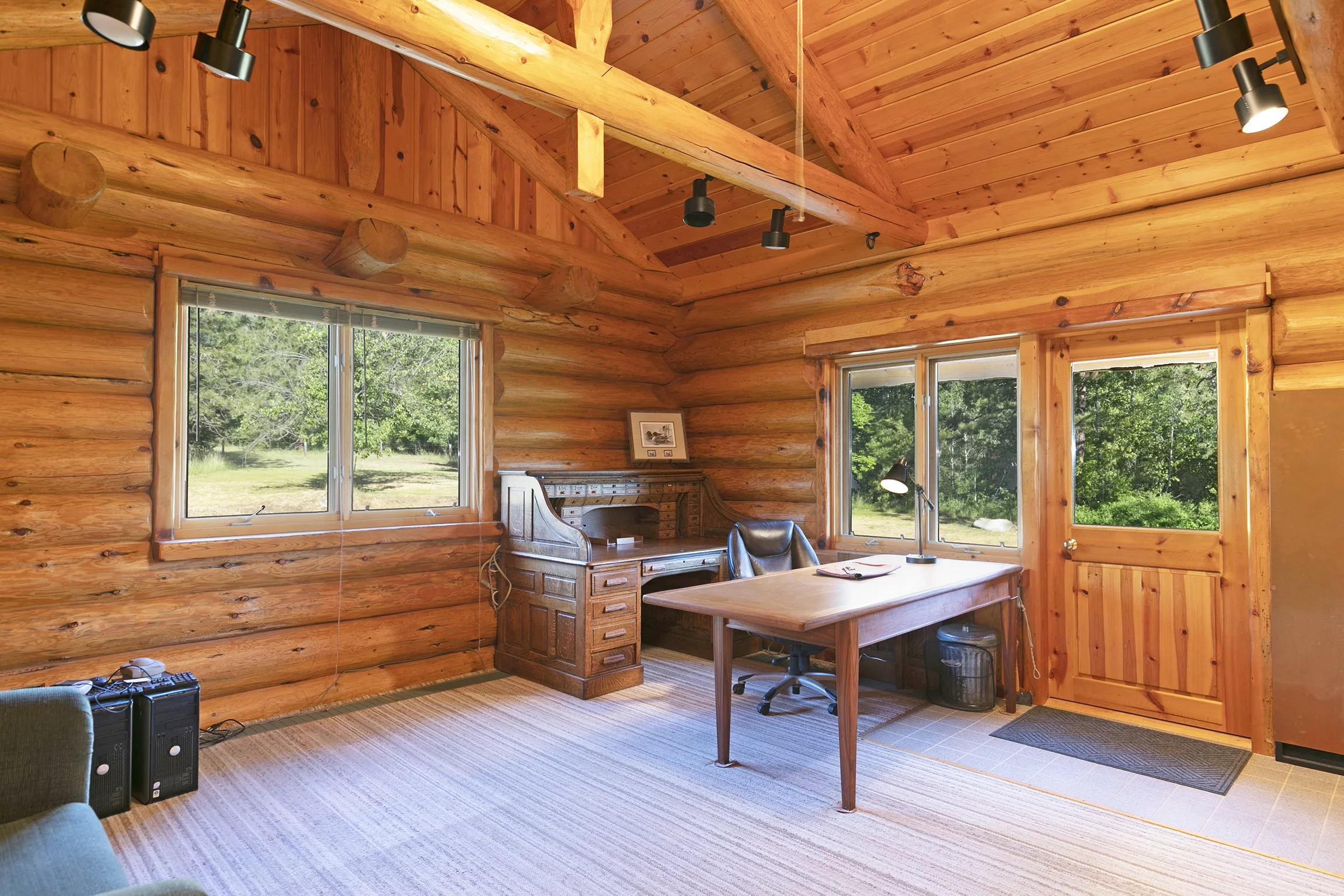 A three-car detached garage sits adjacent to the main home. It features the same log construction as the home and an incredible woodworking shop that could be reimagined as an event space or art studio, thanks to its large picture windows and abundant natural light throughout.
