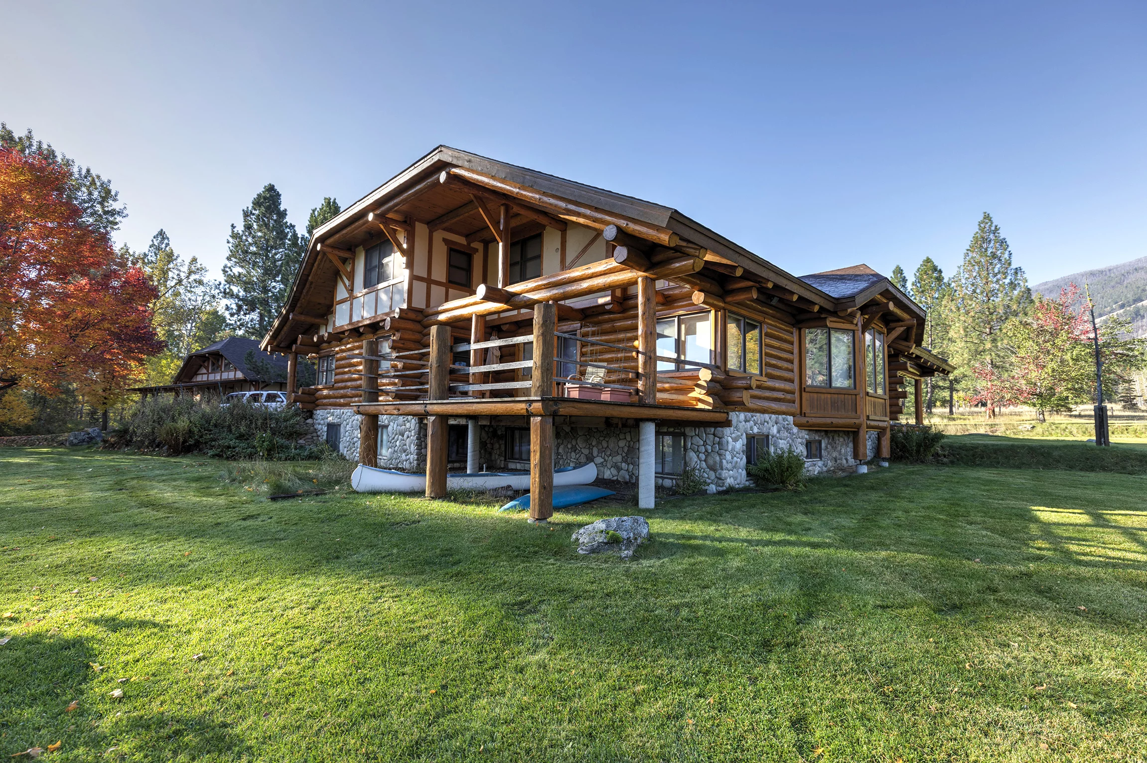 A 6,800 sq ft custom Montana log home is well positioned next to the lively sounds of Tie Chute Creek that traverses the property. The home features a large main-floor primary suite and bathroom, complete with a soaker spa tub that overlooks a private meadow area through picture windows. It also boasts a large, open dining and living area, which showcases custom, detailed wood joinery and framing built onsite.
